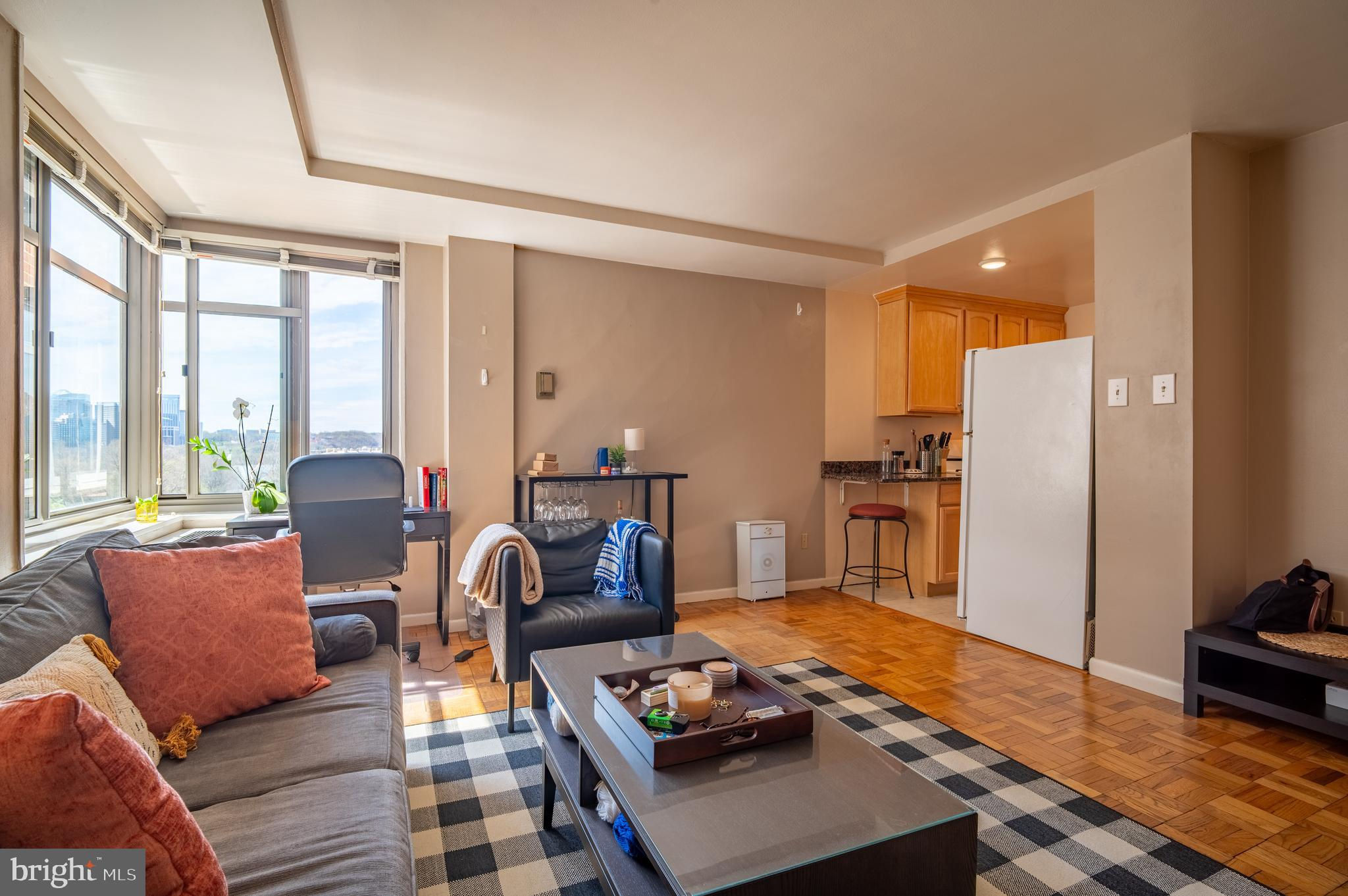 Bright and large corner Studio apartment with Western exposure. Wood parquet floors throughout. Totally renovated kitchen with ceiling height Maple cabinets, granite countertops, full sized refrigerator, range, dishwasher and microwave. The apartment features a large walk-in closet. A well-managed, pet-friendly (Owners Only) and secure building with a 24-hour front desk, and a rooftop pool with fantastic views of Roslyn, the Washington Cathedral, Georgetown, and the Monument. A fitness center, courtyard/patio with grills, Wi-Fi in common areas, community room, and business center complete the building's amenities. The Monthly coop fee includes all Utilities - electricity, water, gas and building maintenance. Underlying Mortgage (UM) is approximately $19,900 with a fee of $229.25 and a monthly Coop Maintenance fee is $635. Two blocks to Foggy Bottom Metro and GW University and Hospital, three blocks to Whole Foods and Trader Joe's. Kennedy Center, World Bank, IFC, State Department, and Georgetown shops and dining are within several blocks. Tenant's lease ends on July 31, 2026. Potential monthly rental income is $1950 per month.